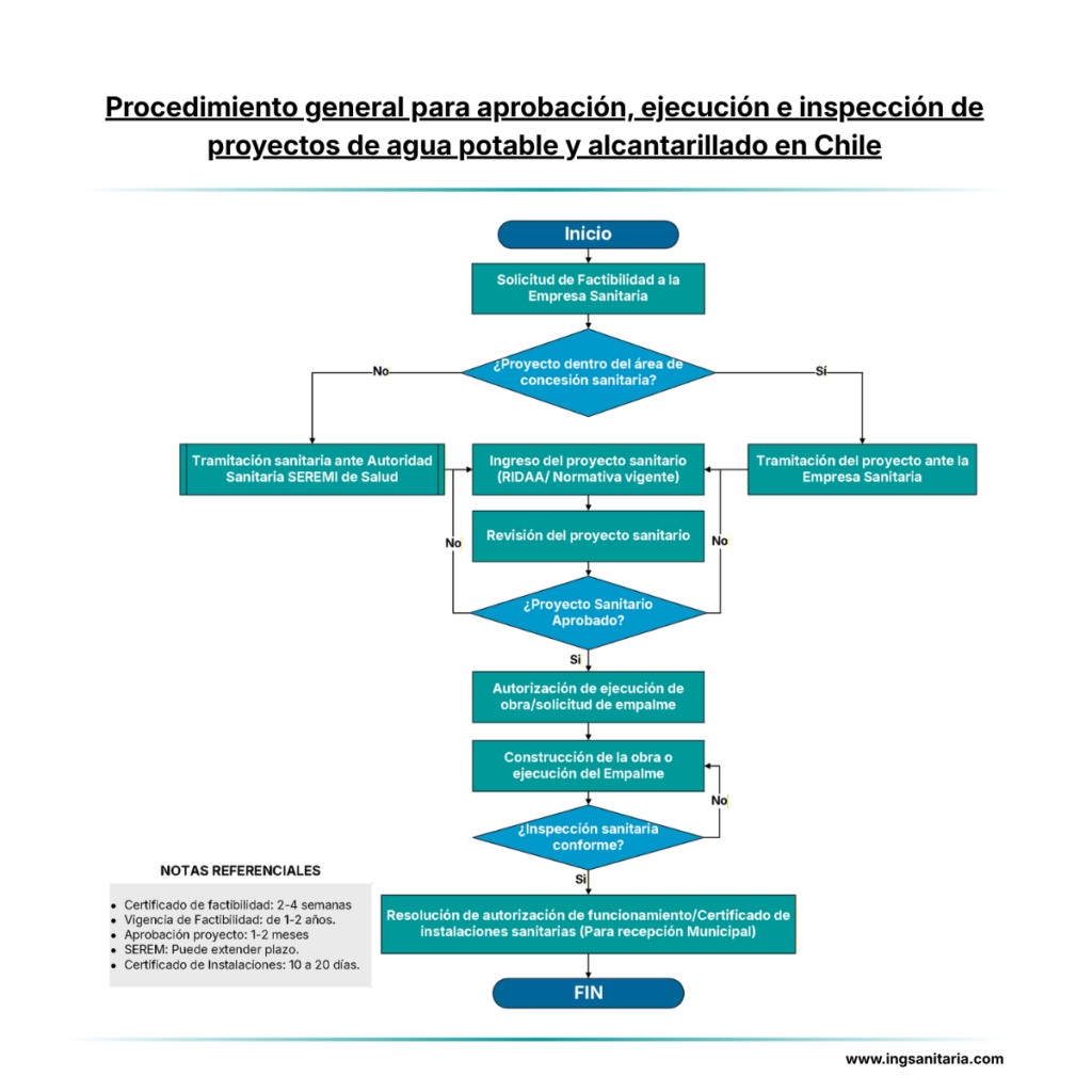 El siguiente flujograma resume el ciclo completo de aprobación, ejecución e inspección de proyectos de agua potable y alcantarillado en Chile, bajo normativa vigente (RIDAA), incorporando la interacción real entre: